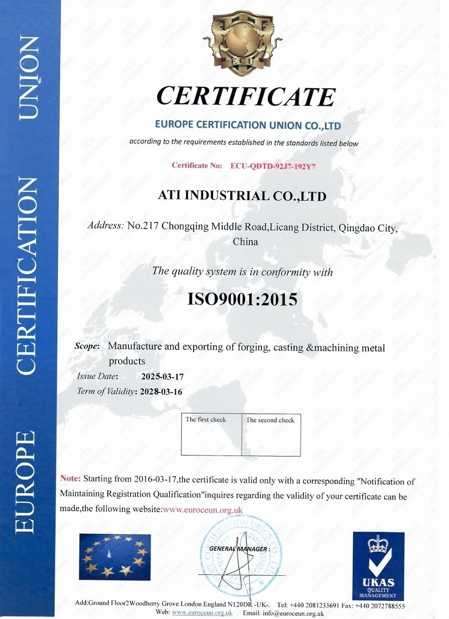 The quality management systerm and the environment management systerm of ATI Industrial Co,Ltd are in accordance with IS09001 and IS014001. These certificates are valid for development ,production anddistribution of forging parts,casting parts and precision CNC machining.